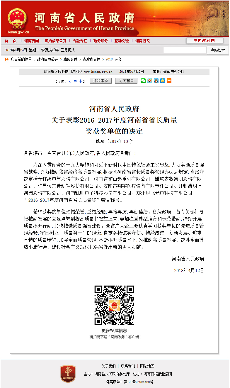 2018年4月23日,河南省人民政府官方网站发布了“关于表彰2016-2017年度河南省省长质量奖获奖单位的决定”,河南矿山获得“2016-2017年度河南省省长质量奖”殊荣。