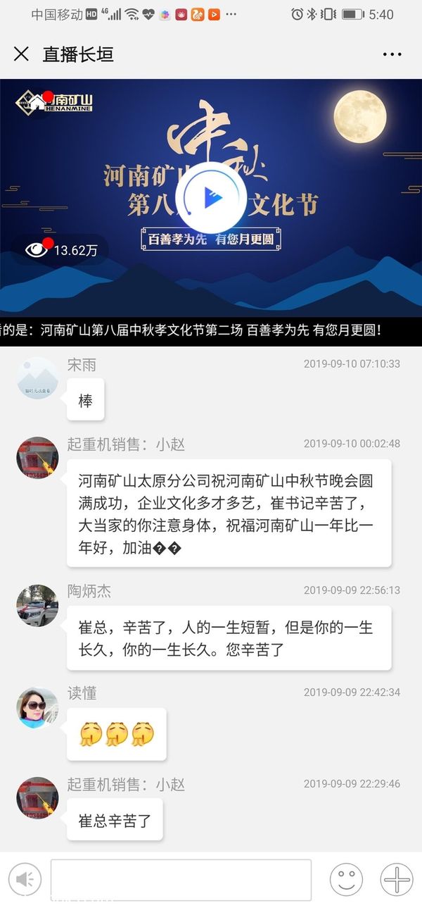 河南矿山第八届中秋孝文化节连续开通了五天直播,让因工作繁忙而不能赶回来的业务经理也能感受到现场的热情、看到父母们的身影。使本届中秋孝文化节更加立体、更加全面地展现了全体矿山人过中秋、天涯海角共此时的美好场面,使古人诗中“千里共婵娟”的浪漫想象变成了现实。